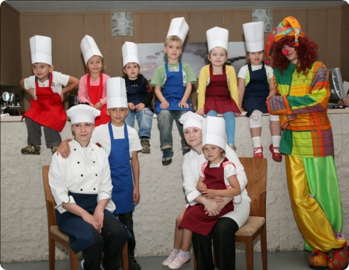 Пока бутерброды запекались, юные кулинары учились готовить вкусный десерт, украшая его свежими ягодами, фруктами, взбитыми сливками и прочими вкусностями. Во время приготовления своего обеда, детям ассистировал веселый клоун, у которого, конечно, все валилось из рук и дети ему помогали, чтобы он не остался голодным.