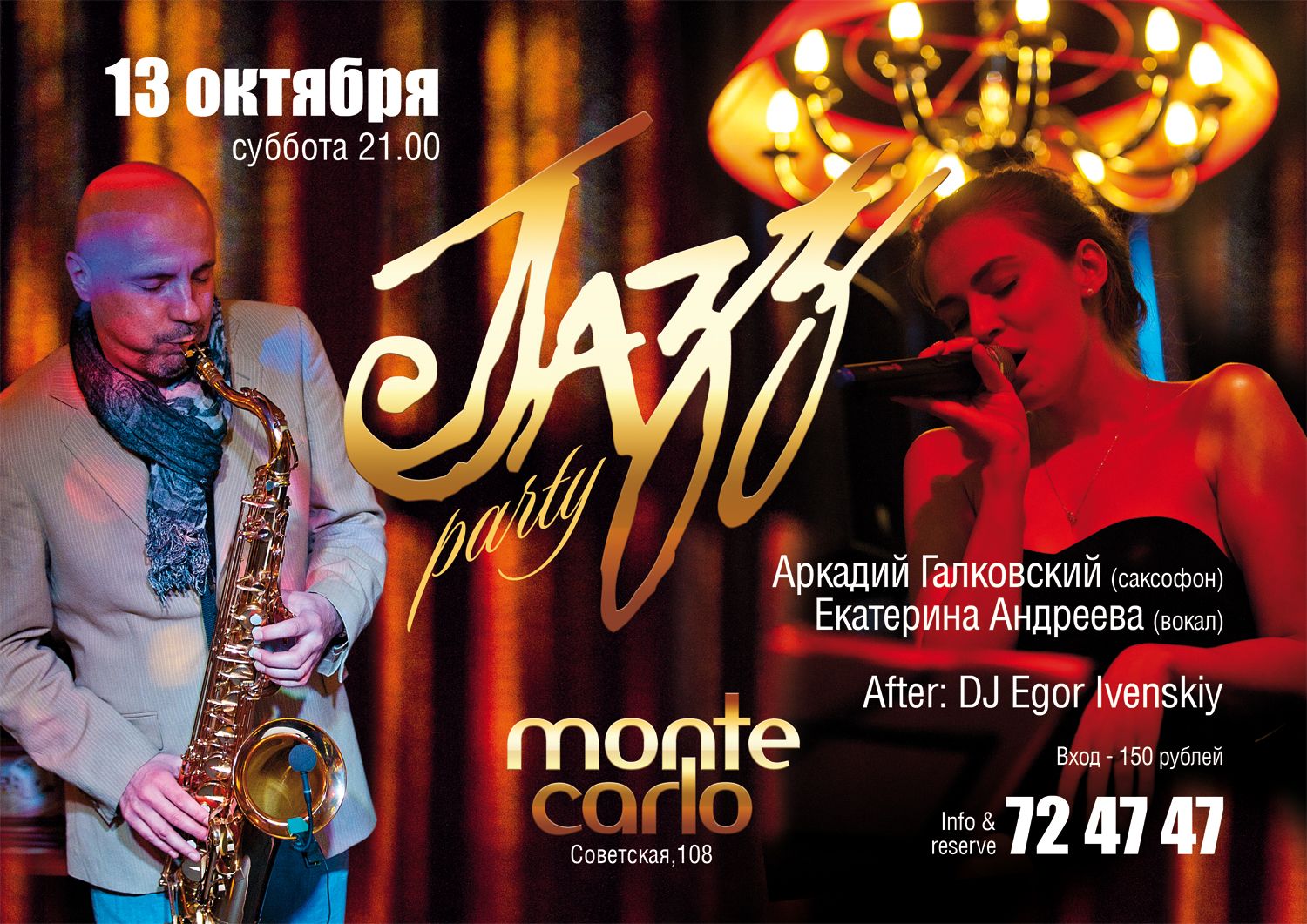 И снова Jazz Party in Monte Carlo 13.10.2012! Аркадий Галковский на саксофоне, Екатерина Андреева поет. Далее играет Егор Ивенский. Начало в 21.00. Вход - 150 рублей. Кафе Монте Карло Псков, ул. Советская, 108 Бронирование - 72 47 47.