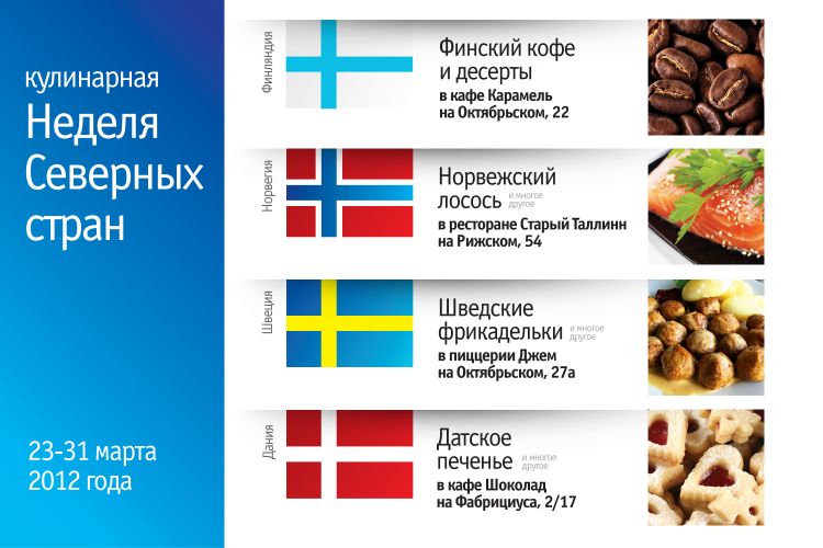 С 23 по 31 марта 2012 года в Пскове впервые пройдет Неделя Северных стран. Группа компаний Ресторанный Партнер познакомит псковичей и гостей города с национальными блюдами северных стран. В псковском кафе Карамель посетители смогут отведать финские десерты и знаменитый финский кофе. В ресторане Старый Таллинн - блюда из норвежского лосося. Кафе Джем приятно удивит блюдами шведской кухни, а кафе Шоколад - датским печеньем.